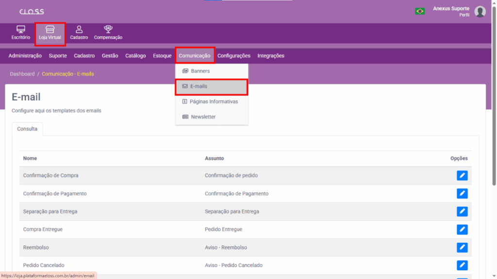 Loja Virtual → Comunicações → E-mails
