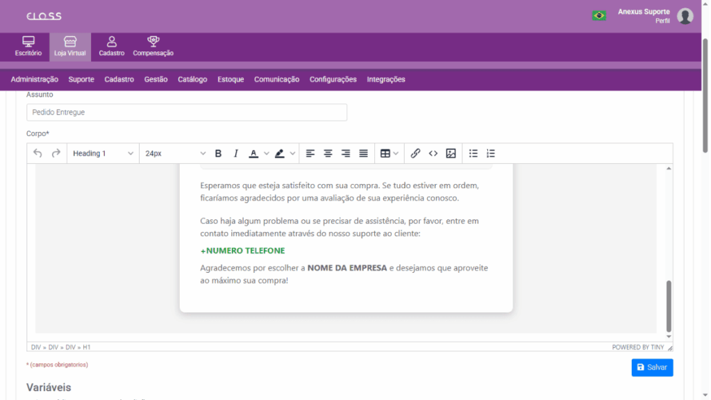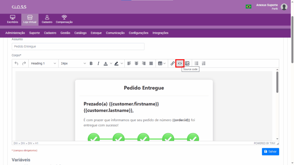 Loja Virtual → Comunicações → E-mails - Faça as edições pelo Source Code