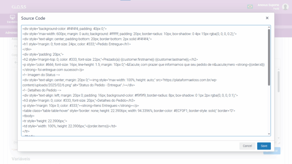 - Evite remover variáveis responsáveis por exibir informações do pedido (como número, status ou valores), pois isso pode comprometer a exibição correta dos dados