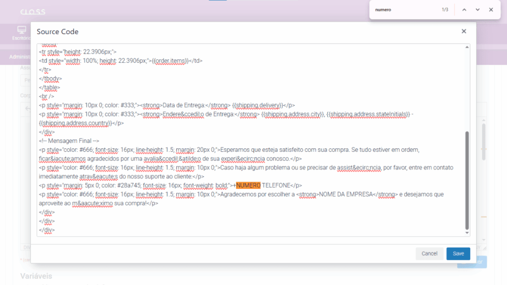 O editor destacará todas as ocorrências, permitindo substituir apenas o conteúdo necessário, sem comprometer a estrutura do e-mail.