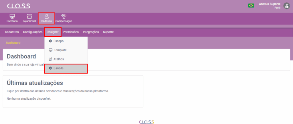Na Plataforma Eloss, o Cadastro conta com uma série de e-mails relacionados ao processo de criação e acesso de usuários, como ativação de conta, boas-vindas e recuperação de senha.
