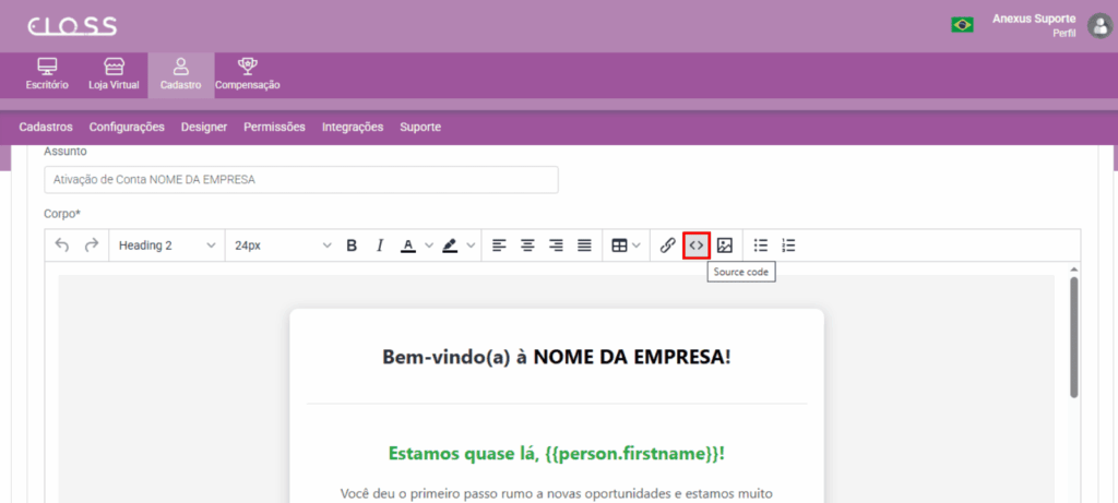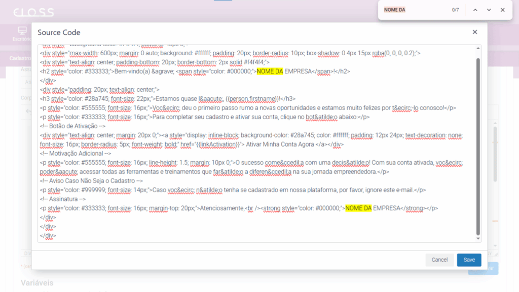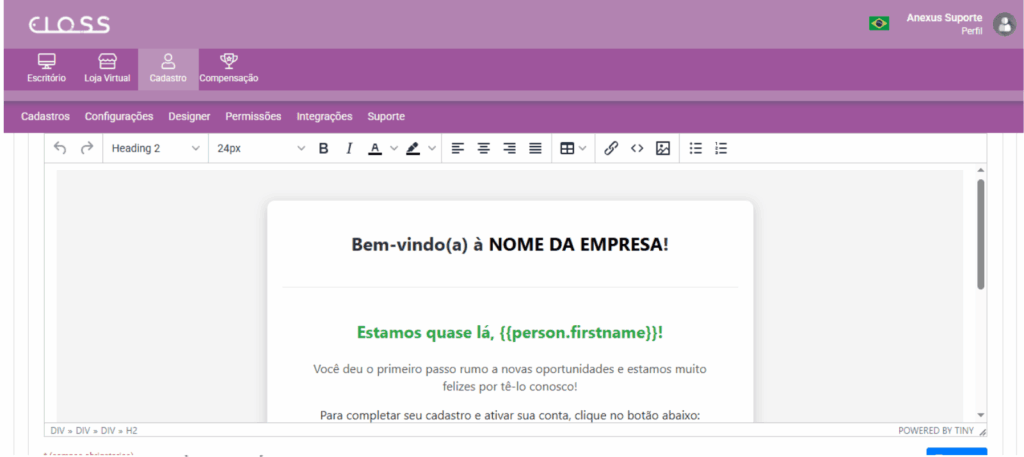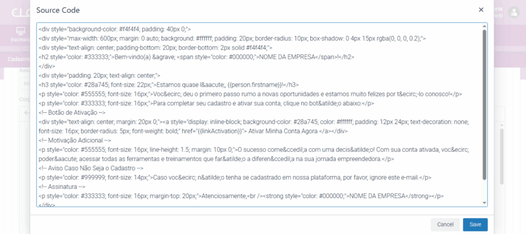 Todos os e-mails do Cadastro são totalmente customizáveis, desde que seja respeitada a estrutura técnica do HTML.