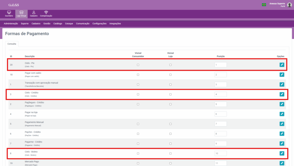 Na lista de formas de pagamento, identifique os métodos relacionados à Cielo.