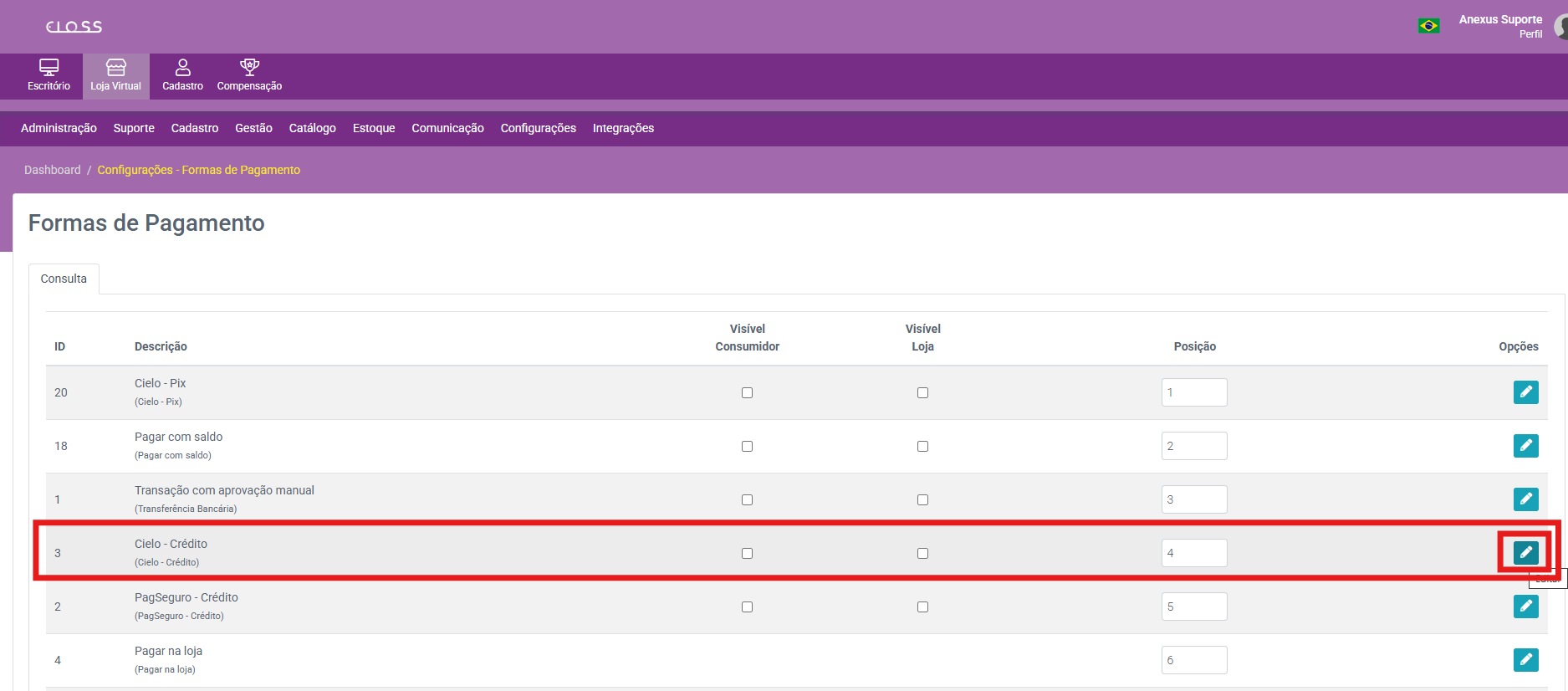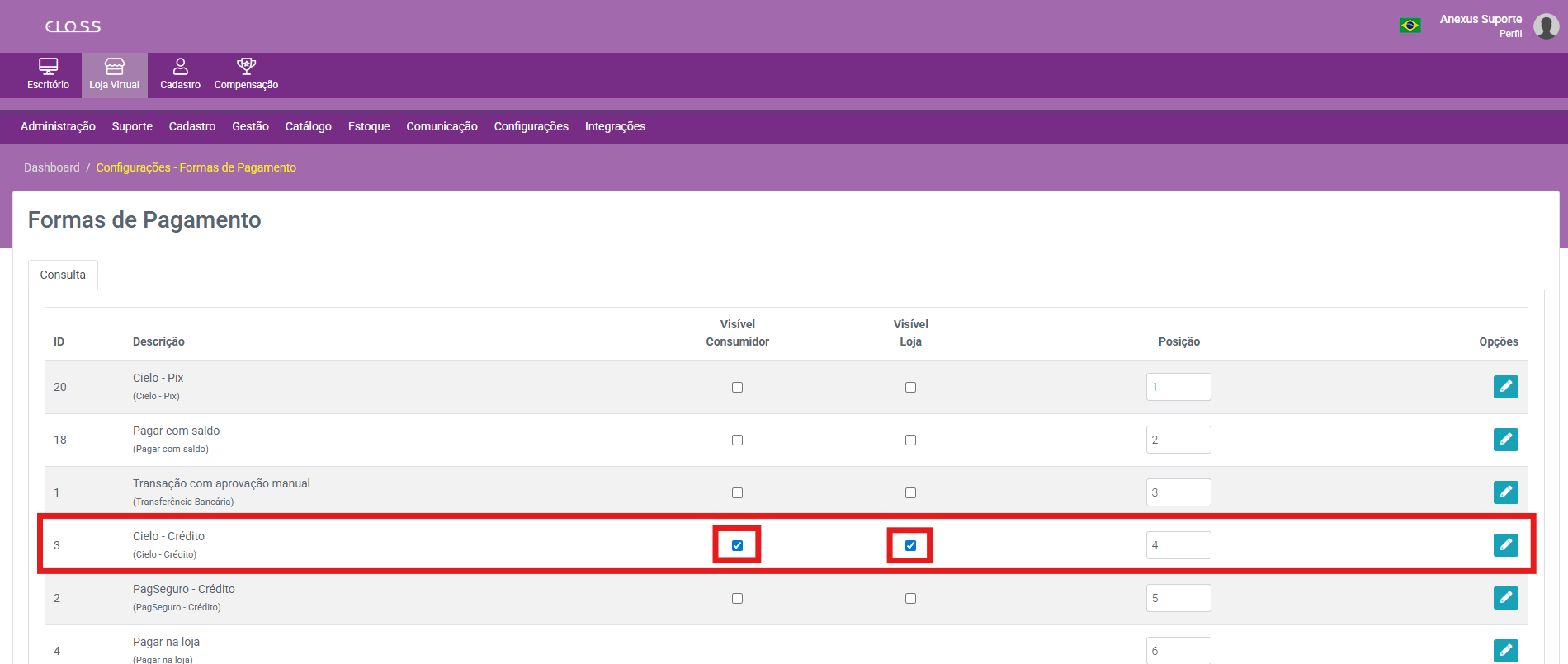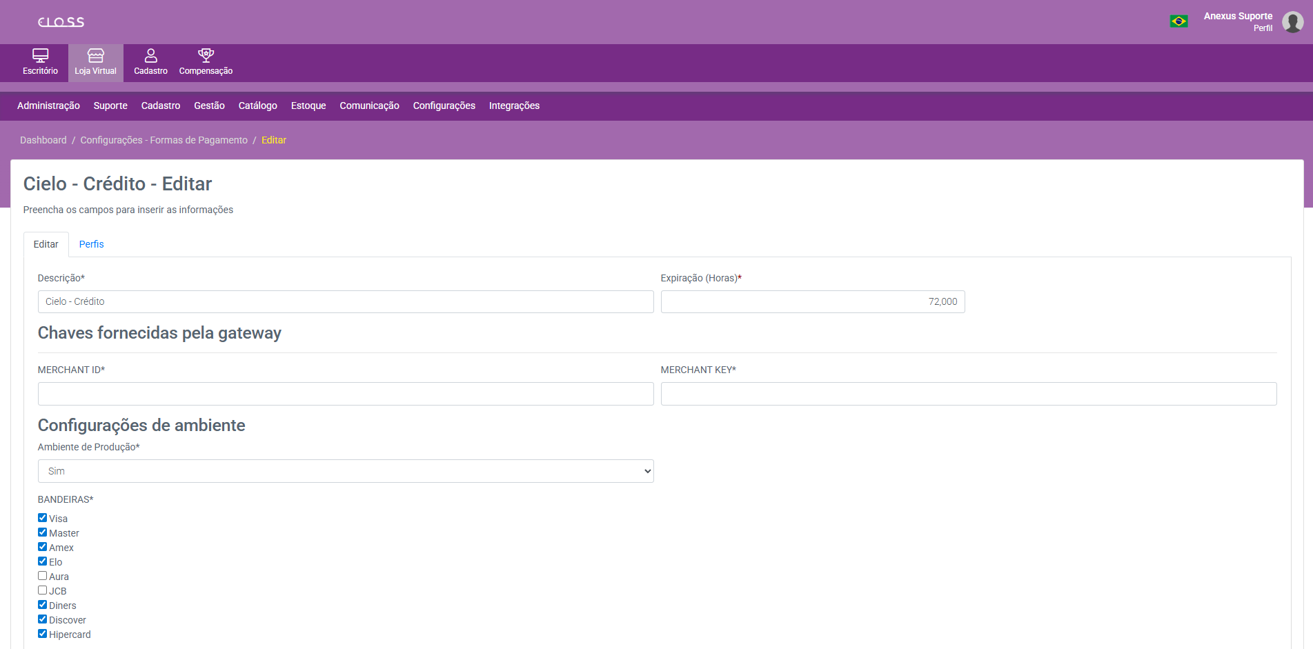 Configurações → Formas de Pagamento → Cielo – Crédito (Editar)