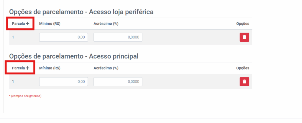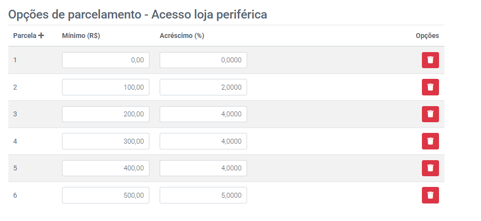 Na imagem abaixo, temos um exemplo de configuração de parcelamento para loja periférica. Observe como foram definidos os valores mínimos e os acréscimos: