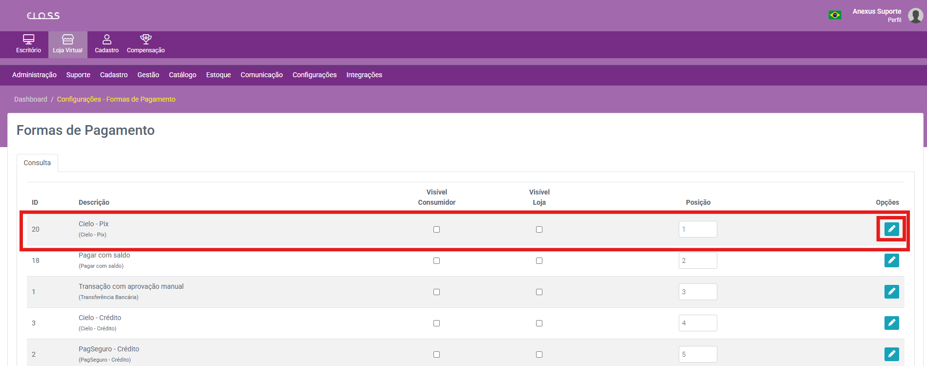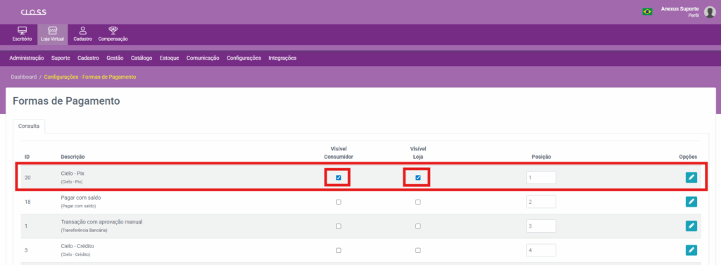 2. Localize a forma de pagamento configurada