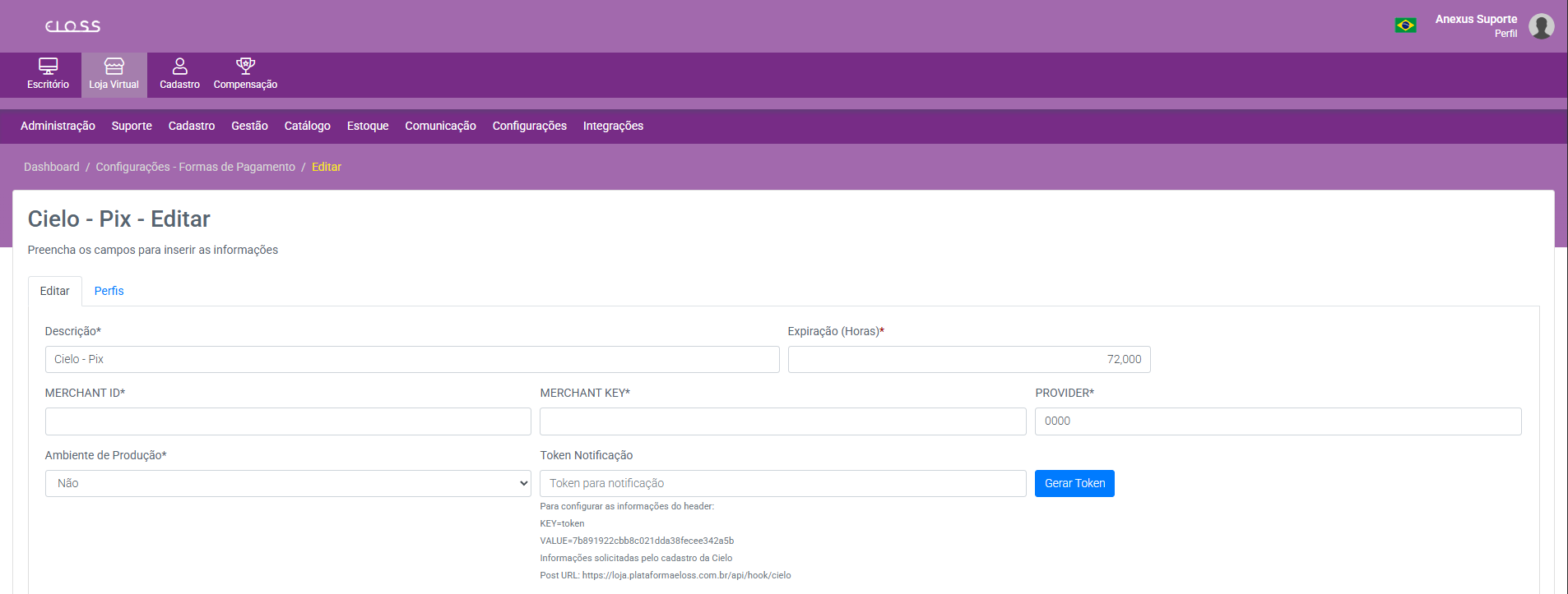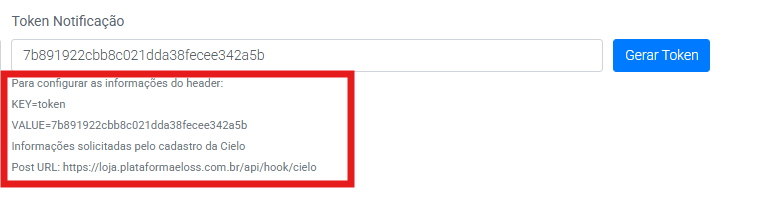 Esse token é único e será utilizado para habilitar a comunicação entre a Cielo e a Plataforma Eloss.